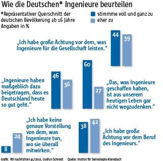 Deutsche Ingenieure genießen in der Bevölkerung großen Respekt. Einer entsprechenden Aussage („Ich habe große Achtung vor dem, was Ingenieure für die Gesellschaft leisten“) stimmen 44 % der Deutschen voll und ganz zu, weitere 36 % eher. Lediglich 2 % widersprechen diesem Statement völlig. Zu diesem Ergebnis kommt eine aktuelle Umfrage des Instituts für Demoskopie Allensbach, die der VDI in Auftrag gegeben hatte.