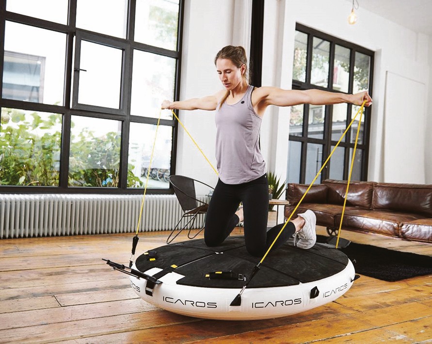 Ob im Stehen, Knien, Sitzen oder Liegen – die Icaros Cloud ist ein aufblasbares Balanceboard für eine Vielfalt an Übungen. Um auf der instabilen Plattform das Gleichgewicht zu halten, muss der Körper stetig gegenreagieren. Statisches Training war gestern. Neben Kraft und Kondition werden auch Beweglichkeit, Koordination und Gleichgewichtssinn verbessert. Das gilt auch für die stabilisierende Tiefenmuskulatur. Je nach Druck in der unteren Luftkammer ist die Cloud ruhiger oder instabiler gelagert. Mit der Icalethics App für Smartphone oder Tablet werden Trainingsfortschritte messbar. Preis: 1399 €.