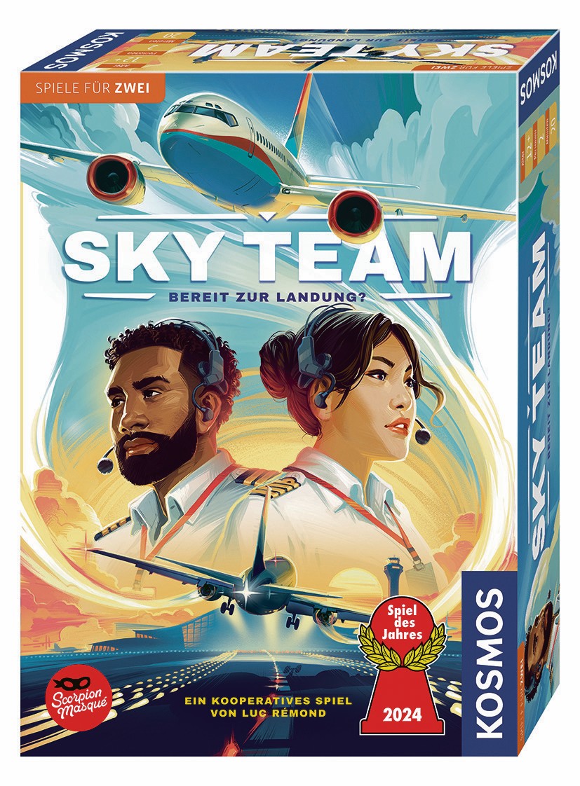 Bei dem kooperativen Spiel „Sky Team“ versuchen die Spielenden, als Pilot und Co-Pilot einen Jumbojet auf unterschiedlichen Flughäfen dieser Welt zu landen. Möglichst geschickt müssen dazu Würfel den Funktionen im Cockpit zugeordnet werden, um etwa die Geschwindigkeit zu kontrollieren, die Landeklappen sowie das Fahrwerk auszufahren und Kollisionen mit anderen Flugzeugen zu vermeiden. So gelingt eine verblüffend gute Simulation eines Landeanflugs. Das Zweipersonenspiel aus dem Kosmos Verlag, ausgezeichnet zum „Spiel des Jahres 2024“, kostet ca. 25 €.