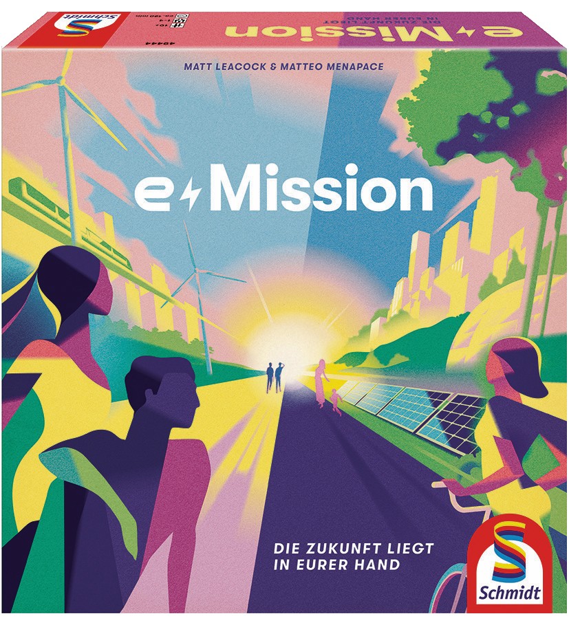 Bei dem Spiel „e-Mission“ nehmen die Spielenden die Rolle von China, den USA, Europa oder dem Globalen Süden ein und versuchen gemeinsam, den Klimawandel einzudämmen. Wie in der Realität starten alle mit unterschiedlich hohem Energiebedarf sowie unterschiedlich hohen Emissionen. Ziel ist es, mit eigenen und globalen Klimaprojekten dafür zu sorgen, dass weniger Emissionen produziert werden, als die Erde aufnehmen kann. Als Clou bei diesem thematisch stimmigen Spiel trägt jede Projektkarte einen QR-Code, der auf Informationen zum realen Projekt verlinkt. Erschienen bei Schmidt Spiele für ca. 60 €.