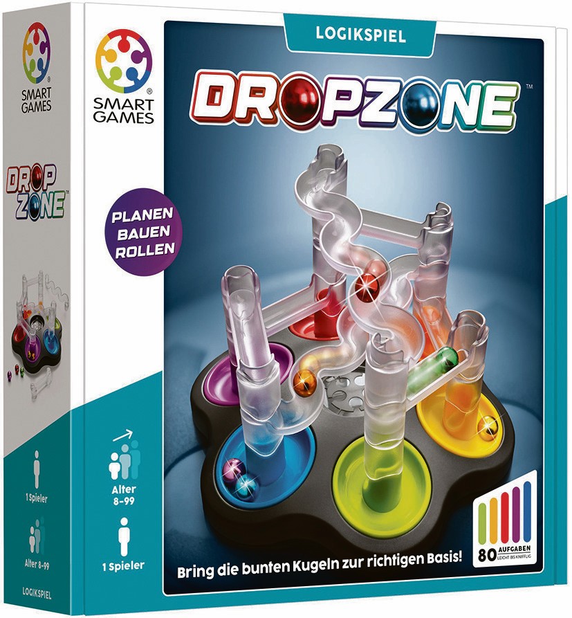Beim Knobel-Bauspiel „Drop Zone“ müssen immer komplizierter werdende Kugelbahnen mit verschiedenen Bahnelementen gebaut und die Murmeln zu den jeweils vorgegebenen Auffangschalen geführt werden. Die Aufgaben werden dabei immer herausfordernder. Bis zu fünf Kugeln müssen ihren richtigen Weg finden, die Bahnen geschickt miteinander verbunden und die richtigen Bauelemente eingesetzt werden. Als Schwierigkeit gibt die Aufgabe auch vor, wie viele Bauteile verwendet werden dürfen. Die herausfordernde Knobelei von Smart Games ist für ca. 25 € erhältlich.