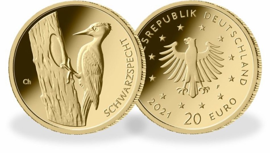 So finden wir auf der in diesem Jahr erschienenen 20-€-Sammlermünze in Gold zum Thema „Heimische Vögel“ eine gelungene Darstellung des Schwarzspechtes. Diese sechsteilige Serie wurde 2016 begonnen und beinhaltete außerdem Abbildungen von den Vogelarten Nachtigall, Pirol, Uhu, Wanderfalke, Weißstorch. Die Version mit dem Schwarzspecht ist die letzte der Serie. Die Münzen der Serie weisen ein Gewicht von 3,89 g auf (= 1/8 Unze Feingold) und haben einen Durchmesser von 17,5 mm. Geprägt wurden sie in allen fünf offiziellen Prägestätten: Berlin (A), München (D), Stuttgart (F), Karlsruhe (G), Hamburg (J). Der Buchstabe der Prägestätte befindet sich jeweils auf der Wertseite, dem Avers. Der Ausgabepreis bei der Münze Deutschland betrug 240,21 €. Aktuell gekauft können sie vor allem über den Münzenfachhandel. Bei der Münze Deutschland selbst kann man die Goldmünzen nur mit einer Vorabbestellung erwerben.