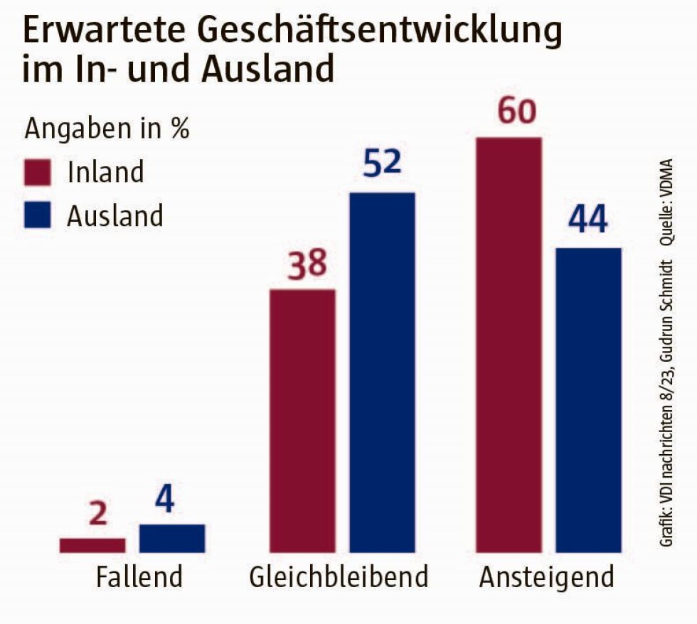 Ukrainekrieg, steigende Energiekosten, Zinswende … All das kann die Stimmung unter den deutschen 3D-Druck-Firmen offenbar nicht trüben. Mit Blick auf die kommenden zwölf Monate erwarten 60 % der Unternehmen steigende Umsätze auf dem Binnenmarkt. Nur 2 % gehen von fallenden Zahlen aus. Auch das Auslandsgeschäft wird mehrheitlich durch die rosa Brille gesehen: 44 % rechnen mit einem Exportwachstum, nur 4 % kalkulieren einen Abschwung ein. Der Rest erwartet jeweils ein unverändertes Niveau.