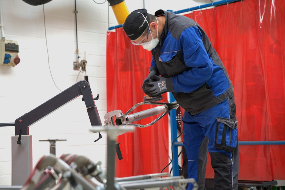 Zwischen den gedruckten Teilen verbaut das Jungunternehmen Rohre aus Chrommolybdän-Stahl (25CrMo4). „Das Material lässt sich gut verarbeiten und hat eine Grundelastizität“, so Meinecke. Vor dem Fügen wird der Querschnitt der Rohre noch in eine Tropfenform gebracht, um die Steifigkeit zu erhöhen.