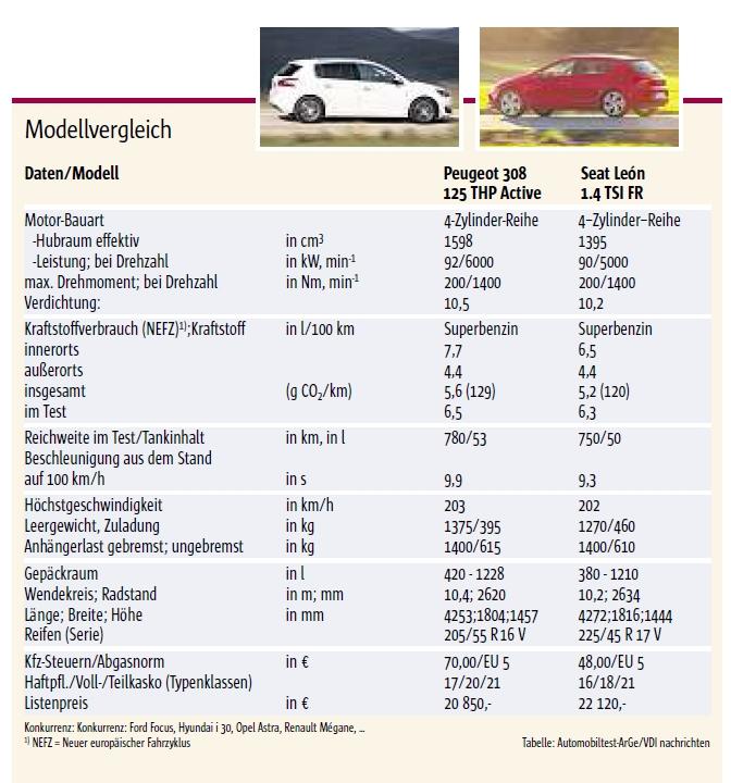 Auf den neuen 308 setzt Peugeot große Hoffnungen. Das Segment der Kompaktwagen ist jedoch stark besetzt. Dort warten ernst zu nehmende Gegner wie der Seat León. Die spanische Marke profitiert vom Baukasten des Mutterkonzerns VW und der León vom VW Golf als Basis. Der Franzose punktet vor allem mit seinem komfortablen Fahrwerk und großen Gepäckraum; der León mit seiner Agilität und dem vorbildlichen 1,4-l-Turbobenziner.