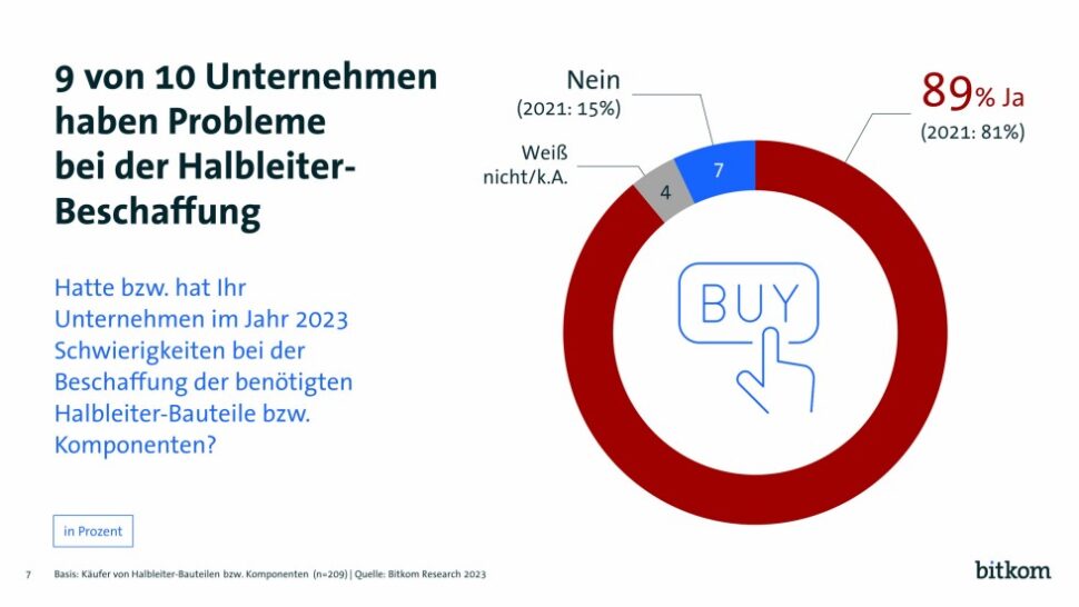 Der Umfrage zufolge ist bisher in diesem Jahr der Mangel an Halbleitern für 89 % der befragten Unternehmen „ein gravierendes Problem“ – durch Schwierigkeiten bei der Beschaffung von Halbleiterbauteilen oder -komponenten. Das seien acht Prozentpunkte mehr als 2021. Die Schwierigkeiten sind vielfältig: