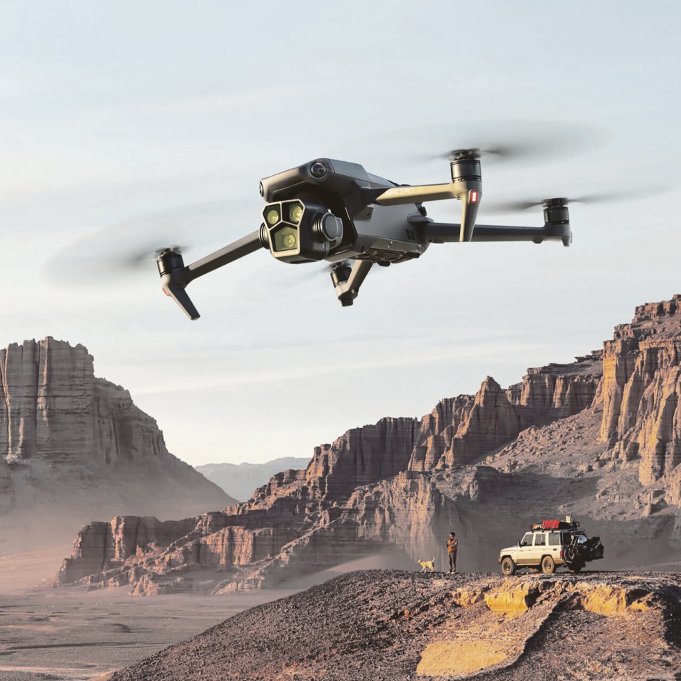 Das Flaggschiff von DJI ist die DJI Mavic 3 Pro. Eine Hasselblad-Kamera wird begleitet von zwei Telekameras. Deren Brennweiten von 24 mm, 70 mm und 166 mm lassen sich zu einem Hybrid-Zoom kombinieren. Fotos und Videos haben eine Auflösung von bis zu 5120 x 3956 Pixel (50 Bilder/s). Mit geringer HD-Auflösung sind alternativ bis zu 200 Bilder/s möglich. Wie bei den meisten DJI-Drohnen sind Funktionen wie einer Person folgen, Rückkehren, Landen sowie Hinderniserkennung integriert. Der Akku hält 36 min – das ist Rekord. Bei einem Gewicht von 900 g überschreitet das Fluggerät laut der EU-Drohnenverordnung die Grenze (500 g), ab der man einen „großen Drohnenführerschein“ benötigt. Preis: ab 2099 €.