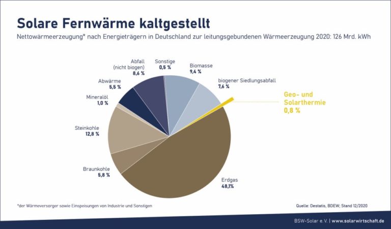Der BSW forderte Anfang November, die Politik solle „solare Fernwärme nicht länger kaltstellen“. Konkret geht es darum, dass eine geplante Bundesförderung für effiziente Wärmenetze seit Monaten auf Eis liegt und zudem aus Verbandssicht unterfinanziert sei. Deutschlands Fernwärmenetz sei „ein riesiger weißer Fleck auf der Landkarte der Energiewende“.