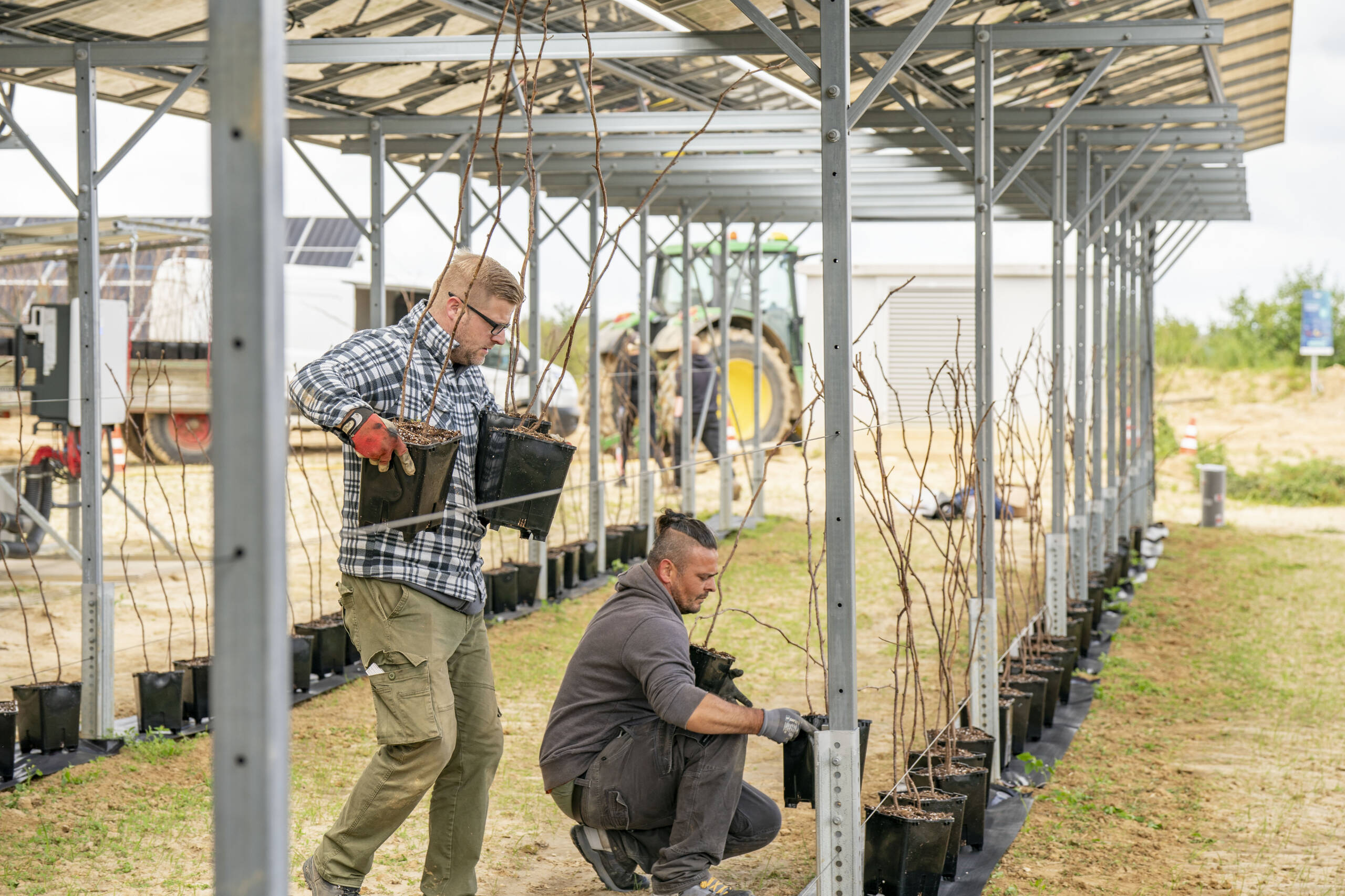 Unter diesen Solardächern wachsen zunächst Klee, Gras und Himbeeren. Nächstes Jahr sollen Getreide, Gemüse und Kartoffeln angebaut werden. Das Ziel ist, durch die Erprobung dieser Technologien zu verstehen, wie sich die landwirtschaftliche Nutzung auf die Solarstromproduktion auswirkt und welche Bewirtschaftungsmethoden am besten geeignet sind.