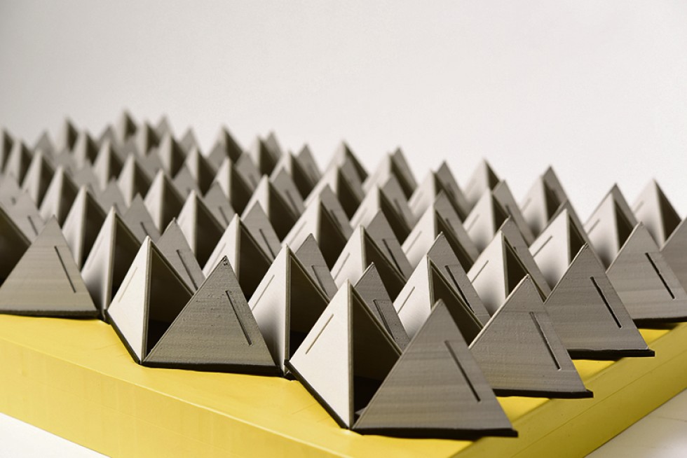 Drähte und Metallteile, die sich nach dem mechanischen Verformen durch Wärme wieder in die Ausgangsform zurückbringen lassen, sind sehr einfache Anwendungen für Formgedächtnismaterialien. Inzwischen rückt das Prinzip aber zunehmend in den Fokus der Antriebstechnik. Denn über elektrische Impulse lassen sich damit Leichtbaukonzepte in der Aktorik realisieren. Drähte können beispielsweise als Linearantriebe eingesetzt werden, die flexibel wie ein Kabel in einem Bauraum verlegt werden können. In einem der jüngsten Anwendungsfälle sorgen Formgedächtnisaktoren für einen guten Klang, indem akustisch individuell veränderliche Oberflächen das Hallvermögen von Wänden gezielt beeinflussen. Das verbessert z. B. die Bedingungen für Musiker in Proberäumen deutlich. Die akustische Modulwand SoundAdapt (im Bild) wurde im Rahmen des Innovationsnetzwerks smart³ von Designerinnen, Ingenieuren und Bühnentechnikern entwickelt. Das Fraunhofer-Institut für Werkzeugmaschinen und Umformtechnik IWU, Chemnitz/Dresden, war daran maßgeblich beteiligt. Die Technik kommt unter anderem in der Semperoper Dresden zum Einsatz. ciu