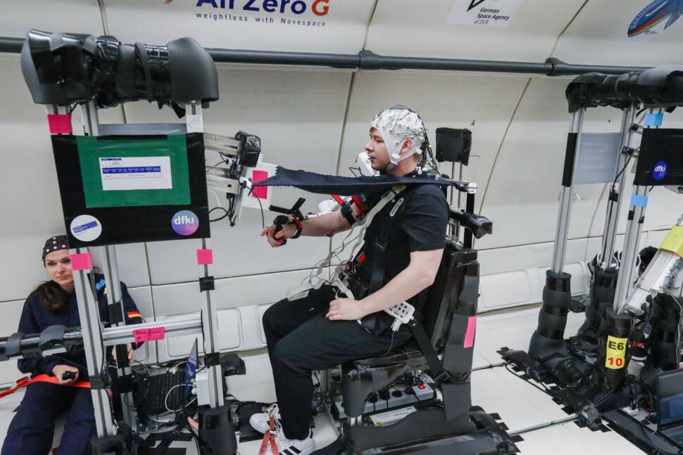 Im Projekt NoGravEx haben die Forschenden einen Ansatz weiterentwickelt, der die Mikrogravitation mit dem Exoskelett simuliert. Das System erkennt dabei das Gewicht der Arme einer Person und kompensiert es, sodass sich die Arme schwerelos anfühlen oder so schwer wie auf einem Planeten wie dem Mond. Um Daten für den Vergleich der echten mit der simulierten Schwerelosigkeit zu bekommen, nahmen die Forschenden vor wenigen Tagen an der 42. DLR-Parabelflugkampagne im französischen Bordeaux teil.