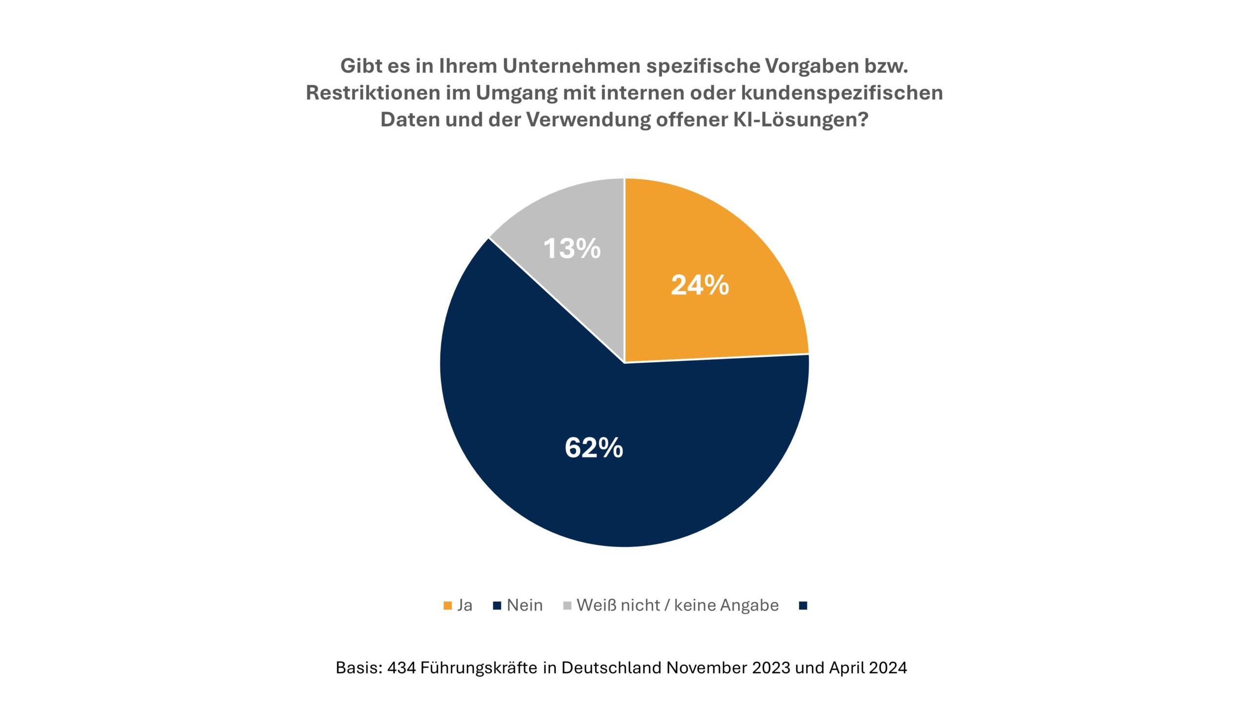 Fast zwei Drittel (62 %) der befragten Führungskräfte gaben an, dass es in ihrem Unternehmen keine spezifischen Vorgaben bzw. Restriktionen im Umgang mit internen oder kundenspezifischen Daten im Zusammenhang mit der Verwendung offener KI-Systeme gibt. Nur 24 % berichteten, über solche Vorgaben zu verfügen. Weitere 13 % konnten darüber keine Angaben machen oder waren sich nicht sicher.