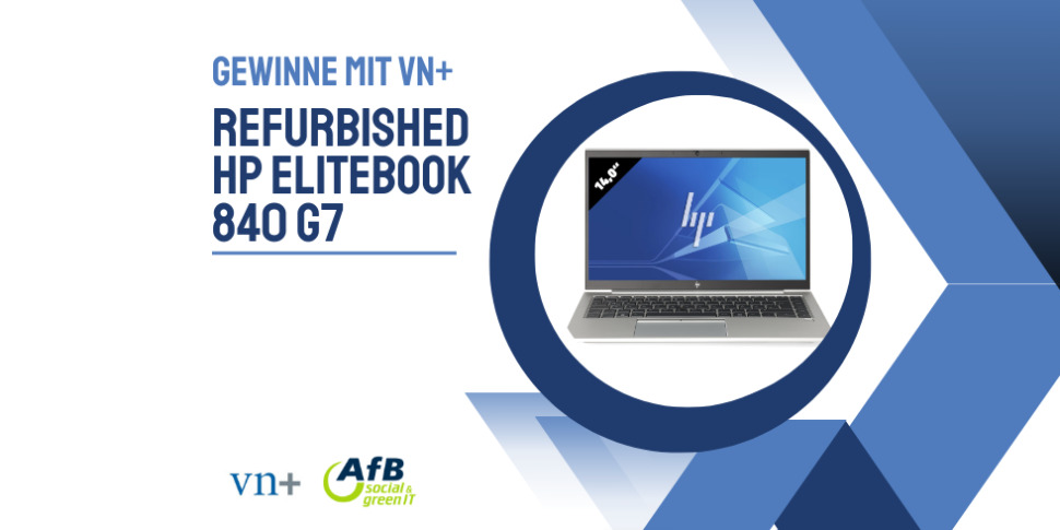 Gewinnen Sie mit Vn+ ein HP EliteBook 840 G7! Der Laptop wurde von Europas größtem gemeinnützigen IT-Unternehmen Afb generalüberholt.