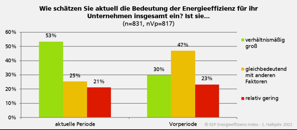 Die Bedeutung wird noch an einer anderen Zahl deutlich: Noch vor einem Jahr haben 50 % der Unternehmen angegeben, dass Energieeffizienz für sie gleichbedeutend mit anderen Faktoren sei. Lediglich für 30 % war die Bedeutung höher. Das hat sich umgekehrt. Inzwischen ist Energieeffizienz für 52 % der wichtigste Faktor und nur noch für 25 % gleichbedeutend mit anderen Faktoren.