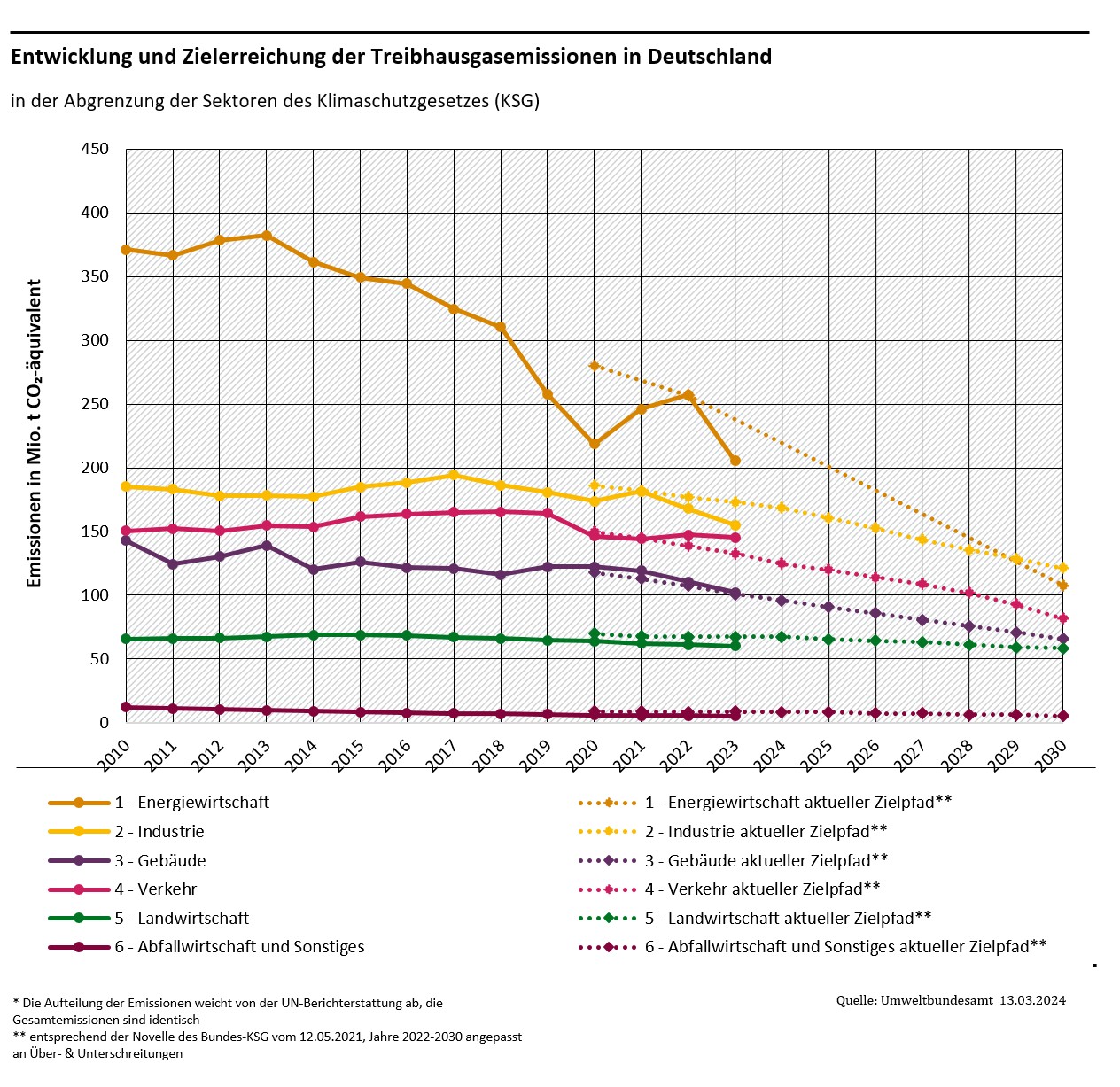 Es ist auf den ersten Blick eine richtige Erfolgsmeldung, die das Umweltbundesamt am Freitag, dem 15. März 2024, herausgab. „Klimaemissionen sinken 2023 um 10,1 % – größter Rückgang seit 1990“, war sie überschrieben. 673 Mio. t an CO2-Äquivalenten seien freigesetzt worden, 76 Mio. t weniger als 2022, das sind besagte -10,1 %. Das ist eine Rekordmeldung. Kein Wunder, dass sich kurz darauf Robert Habeck aus dem Bundeswirtschafts- und Klimaschutzministerium meldete: „Wenn wir Kurs halten, erreichen wir unsere Klimaziele 2030“, lässt er sich zitieren. Bis dahin soll laut Klimaschutzgesetz (KSG) der deutsche Ausstoß an Treibhausgasen um 65 % im Vergleich zum Stand des Jahres 1990 sinken.