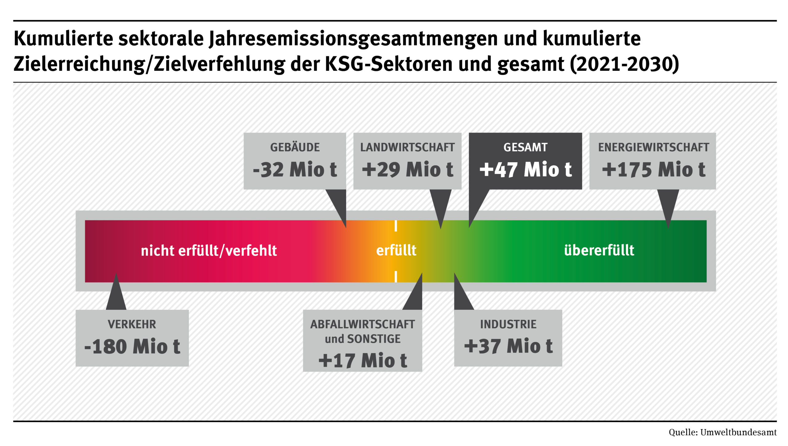 - Die Sektoren Landwirtschaft sowie Abfallwirtschaft und sonstiges übererfüllen ihre Ziele um 29 Mio. t bzw. um 17 Mio. t.