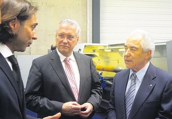Technik und Gespräche: Zum 75-jährigen Jubiläum begrüßt der kaufmännische Leiter, Alexander Eisler, im Juni 2013 den bayerischen Innenminister Joachim Herrmann; rechts Firmenchef Friedrich K. Eisler. Foto: Heinz Wraneschitz