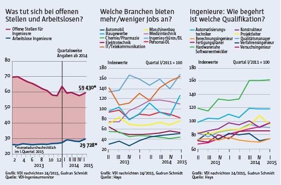 Von Januar bis Ende März waren monatsdurchschnittlich nur rund 29 700 Personen arbeitslos gemeldet – etwa 1800 mehr als im 4. Quartal 2014. Die Arbeitslosenquote in Ingenieurberufen liegt damit beinahe unverändert bei knapp über 2 %. Selbst bei einer Arbeitslosenquote von 3 % sprechen Ökonomen noch von Vollbeschäftigung.