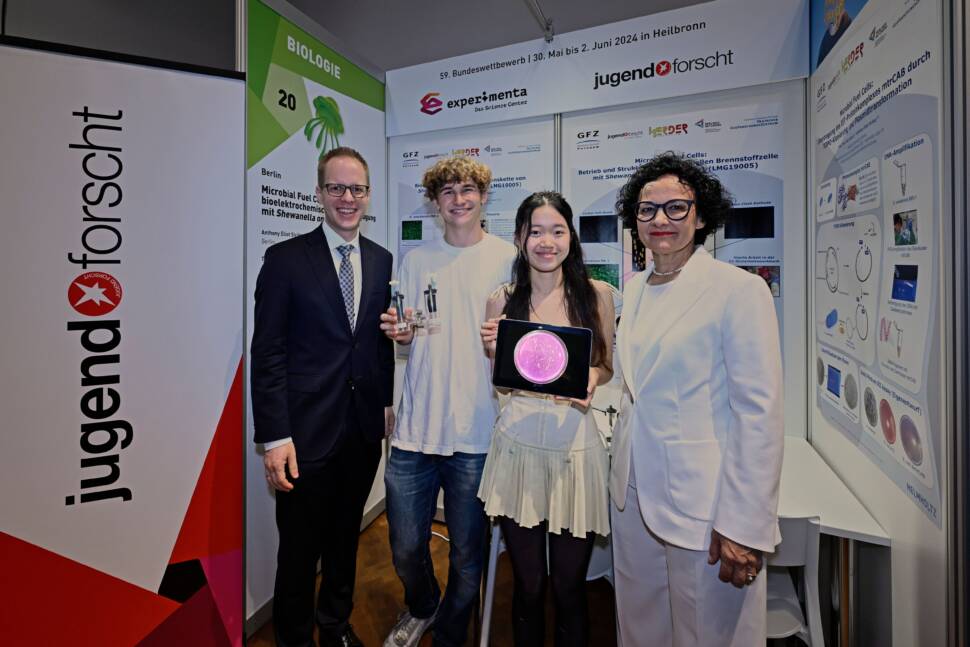 Seit Jahrzehnten arbeiten Forscher daran, mithilfe bestimmter Bakterien Brennstoffzellen zu entwickeln. Anthony Eliot Striker (18) und Tina Thao-Nhi Schatz (18) aus Berlin gelang es nun, mit einem Stamm der Art Shewanella oneidensis MR-1 ein solches System zu etablieren. Es funktioniert nach dem Prinzip einer galvanischen Zelle mit zwei Kammern, die mit leitfähigen Flüssigkeiten gefüllt und über Elektroden verbunden sind, sodass Strom fließen kann. Die beiden jungen Forscher experimentierten unter anderem mit der Zusammensetzung der Elektrolytlösungen. Eine Anwendungsmöglichkeit könnte sein, dass kommunales Abwasser aufgrund der Ähnlichkeit zum verwendeten Bakteriensubstrat möglicherweise für eine Energieerzeugung auf Bakterienbasis genutzt werden könnte. Die beiden errangen den Bundessieg im Fachgebiet Biologie.