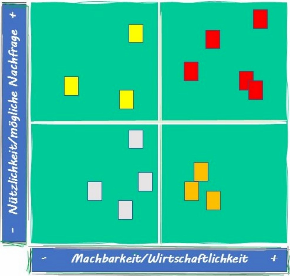 Dabei geht es, wie die Abbildung zeigt, um die Achsen Nützlichkeit/potenzielle Nachfrage und Machbarkeit/Wirtschaftlichkeit. Was aus Sicht des Kunden maßgeblich ist, hat immer Vorrang. Erst dann geht es darum, ob und wie man zur Umsetzung in der Lage ist.