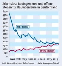 Der jüngsten Statistik der Bundesagentur für Arbeit zufolge gibt es in Deutschland rund 99 100 Bauingenieure. Damit nähert sich die Branche wieder den Beschäftigungswerten um die Jahrtausendwende, als die Talfahrt nach dem Ende des Aufbaubooms in den neuen Ländern begann und 2005/2006 ihren Tiefpunkt erreichte. „Im Schnitt gab es 2006 rund 9200 Arbeit suchende Bauingenieure, im vergangenen Jahr waren es durchschnittlich nur noch 2600“, bilanziert Stiepelmann. „Das ist eine bemerkenswerte Entwicklung.“