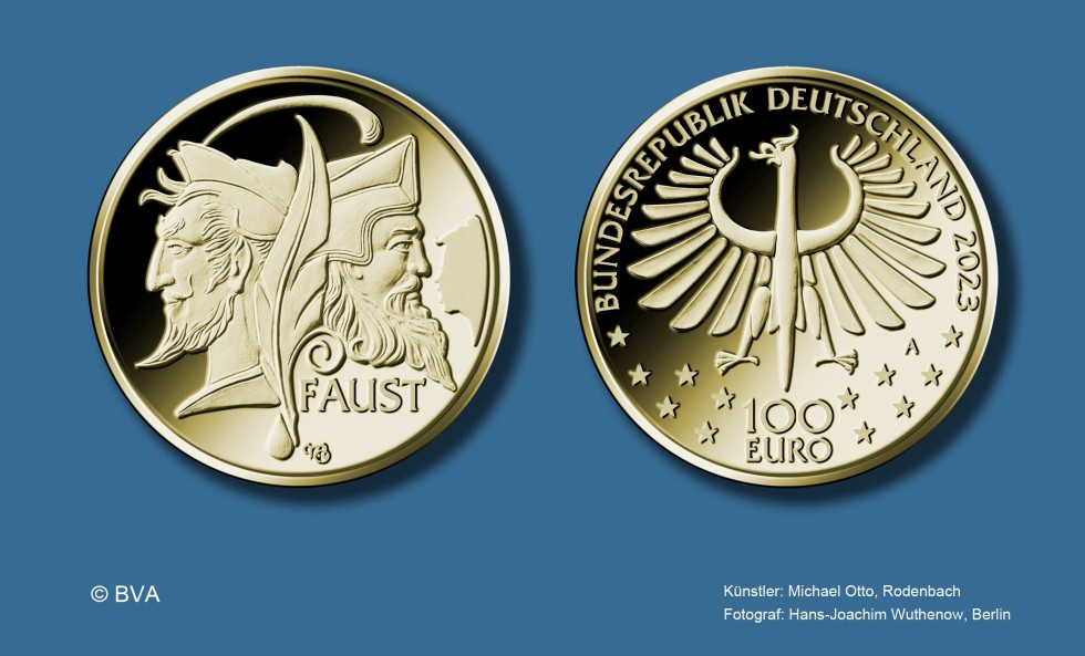 Die dritte Goldmünze des aktuellen Jahresprogramms gehört zu der neuen achtteiligen 100-€-Goldmünzenserie, die unter dem Serientitel „Meisterwerke der deutschen Literatur“ emittiert wird. Den Anfang macht Johann Wolfgang von Goethes „Faust“, eines der weltweit bekanntesten Werke der Literaturgeschichte. Die Münze entstammt dem Entwurf von Michael Otto und bringt mit 15,55 g Feingold eine halbe Unze auf die Waage. Der Durchmesser dieser künstlerisch sehr ansprechenden Münze beträgt dabei 28 mm. Als Ausgabepreis verlangt die Münze Deutschland 974,74 €.