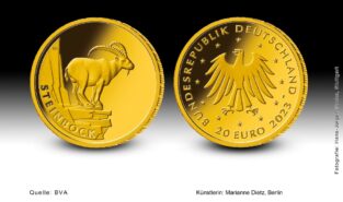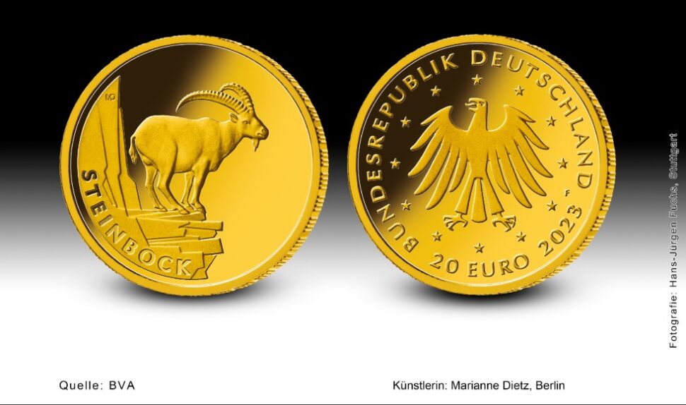 Die für 2023 vorgesehene 20-€-Goldmünze gehört zu der sechsteiligen Serie „Rückkehr der Wildtiere“ und trägt den Titel „Steinbock“. Es ist die zweite Münze dieser Serie. Dabei sollen hier Tierarten vorgestellt werden, die in Deutschland im Bestand gefährdet waren, aber durch erfolgreiche Naturschutzarbeit wieder stabile Populationen bilden.