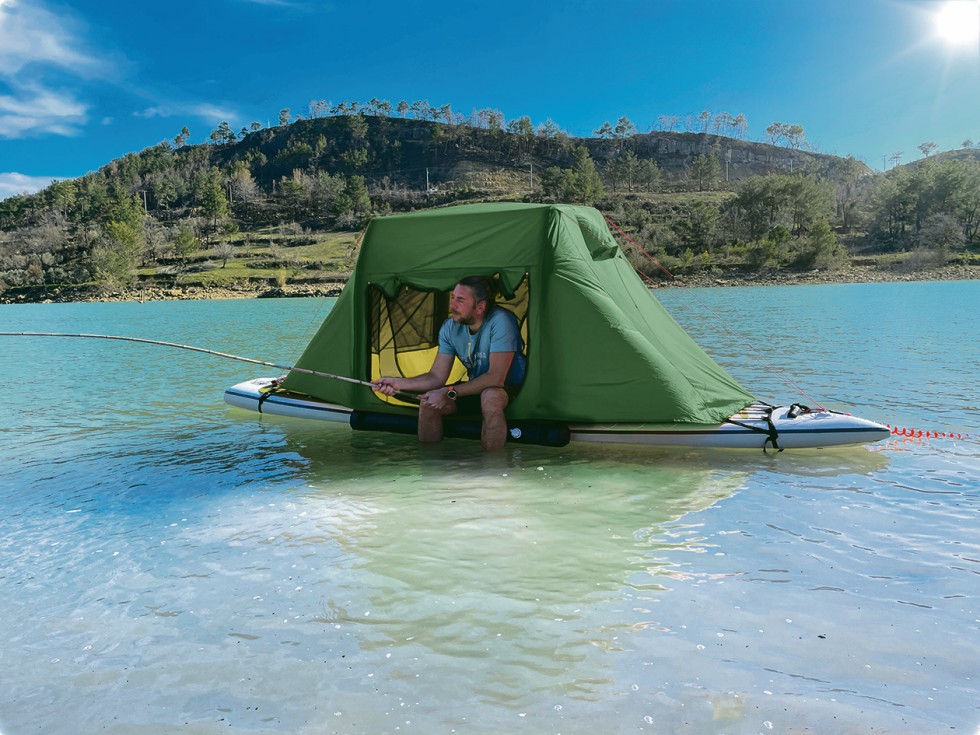 Das Trekkingzelt von Bajao passt auf jedes Stand-up-Paddle (SUP) ab 11,6 m Länge. Durch den aufblasbaren Rahmen wird das Board zu einem festen Bestandteil des Zeltes. Die Sidepipes stabilisieren das Board gegen das Umkippen auf dem Wasser. Sie lassen sich aber abnehmen, sodass man das Trekkingzelt auch ohne SUP als Unterlage direkt auf dem Boden wie ein normales Zelt nutzen kann. Das Packmaß ist so klein, dass es leicht auf einem SUP transportiert werden kann, verspricht der Hersteller. Der Preis für das Trekkingzelt beträgt 599 €.