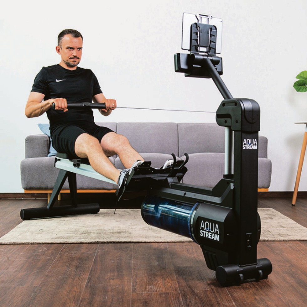 Das Rudergerät AquaStream kann dank des schlanken Designs in vielen Wohnzimmern aufgestellt werden. Das Besondere an AquaStream von Cardiostrong ist die Kombination von Wassertank und Rudersystem, was eine extrem leise Nutzung gewährleistet. Einmal in Schwung, ist vom Widerstand des Wassers im Tank (Fassungsvermögen bis zu 9 l) nahezu nichts mehr zu hören. Ermöglicht wird dies durch drei im Wassertank integrierte Schaufelräder. Der Widerstand des Wassers lässt sich einfach über die Füllmenge im Wassertank regulieren. Preis: 1499 €.
