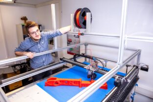 Einer der ersten Masterstudenten in Lichtenfels ist Felix Haberkorn: „Wir haben alle relevanten Verfahren der Additiven Fertigung behandelt – ansonsten ist es aber ein sehr praktisches Studium. Wir tauschen uns wöchentlich mit den Professorinnen und Professoren zu den Projektarbeiten aus und können mit allen Maschinen im Haus arbeiten und eigene Ideen umsetzen. Der Kontakt mit den Unternehmen über Projekte hilft außerdem, die Technologie und ihr Potenzial zu durchdringen.“