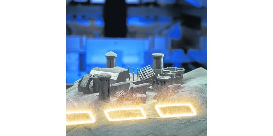 Beim Laserstrahlschmelzen von Metallen wird statt des Kunststoffpulvers ein Metallpulver im Bauraum verteilt. Wieder wird schichtweise verschmolzen. sta