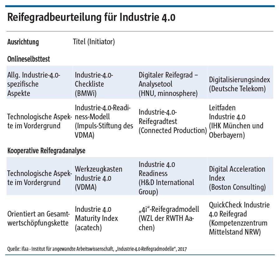 Manche Tests sind eingeschränkt zugänglich. So steht der „Werkzeugkasten Industrie 4.0“ des Maschinenbands VDMA nur den Mitgliedern zur Verfügung. Laut ifaa ist dieser ohnehin eher als Toolbox zur Einführung von Industrie 4.0 zu sehen. Frei zugänglich ist dagegen das Industrie-4.0-Readiness-Modell der zum VDMA gehörenden Impuls-Stiftung.