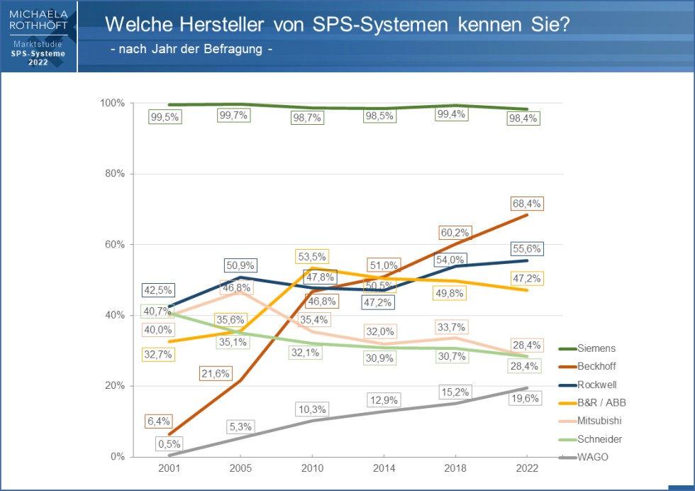 Am stärksten hat sich in den vergangenen Jahrzehnten die Firma Beckhoff entwickelt. War das Unternehmen aus Verl 2001 mit 6 % noch weitgehend unbekannt, ist die Firma heute mit 68 % beim Bekanntheitsgrad die klare Nummer zwei – noch vor Unternehmen wie Rockwell Automation und der inzwischen zu ABB gehörenden B&R. Laut Rothhöft zeigt das, „dass auch ein damals noch kleines Unternehmen im Vergleich zu internationalen Konzernen durchaus Chancen hat, in einem schwierigen Markt große Erfolge zu feiern“. Beckhoff profiliert sich dabei vor allem durch die Erfüllung der technischen Anforderungen in der Branche.