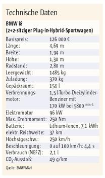 Kleiner Clou des Carbonsportlers: Ein kleiner E-Antrieb mit 15 kW Höchstleistung, der im Riementrieb verbaut ist und kurzzeitig ein Drehmoment von 125 Nm stemmen kann. „Er ist das, was wir Ingenieure ein fleißiges Bauteil nennen“, sagt Thomas Weilnhammer, der für die funktionale Gesamtfahrzeug-Integration verantwortlich war. Der E-Motor macht vieles gleichzeitig: startet, hilft beim Rekuperieren im Stop-and-go-Verkehr und unterstützt beim Boosten. Fazit: Technisch weist der i8 weit nach vorne. Ob die Rechnung auch wirtschaftlich aufgeht, muss die Zukunft zeigen.