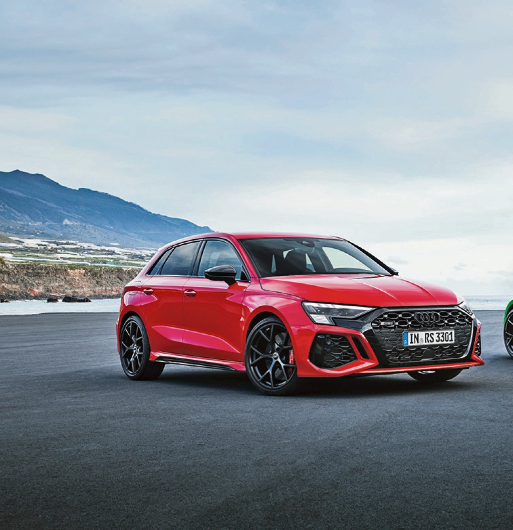 Bei Audi steht RS für rassige Sportwagen. Auch der neue A3 RS reiht sich dort ein: Knapp 300 kW, ein Drehmoment von 500 Nm zwischen 2250 min-1 und 5600 min-1, von 0-100 km/h in 3,8 s, Vmax (abgeriegelt) 250 km/h, optional sind auch 280 km/h möglich. Angeboten wird er als Sportback und als Limousine. Eine Abgasanlage mit vollvariabler Klappensteuerung sorgt dafür, dass der Fünfzylinder trotz Partikelfilter in jeder Lage kernig klingt. Der erstmals eingesetzte RS Torque Splitter verteilt die Antriebsmomente variabel zwischen den Hinterrädern. Seit Mitte August ist der A3 RS in Europa bestellbar. Der Grundpreis für den RS 3 Sportback beträgt 60 000 €, die RS 3 Limousine startet bei 62 000 €.