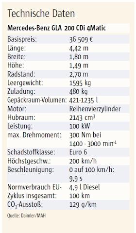 Das Volumenmodell der Baureihe dürfte der GLA 200 CDI 4Matic (ab 36 509 €) werden, dessen 2,2-l-Diesel (OM 651) 100 kW leistet und für den ein Normverbrauch von 4,9 l/100 km angegeben wird. Ende des Jahres soll der 1,6 l kleine Diesel aus der Kooperation mit Renault Einzug in den GLA halten. Der „OM 607“ genannte Vierzylinder leistet 80 kW und wird ab