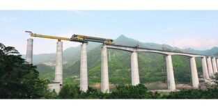 Zurück in China: Am Abgrund angekommen, fährt die gelbe Maschine auf eine Art dicken Stahlträger. Dieser ist in einer Führungskonstruktion mit dem ersten und zweiten Brückenpfeiler verbunden, die bereits über dem Tal aufragen. Die 32 Vorderreifen fahren über den Abgrund –der Koloss gleitet auf dem Unterträger über das Tal, bis das Brückenteil in Position ist. Dann schiebt sich die 77 m lange und 310 t schwere Stahlschlange unter ihm zum nächsten Pfeiler weiter, und das Brückenteil kann an seinem Zielort abgesenkt werden.