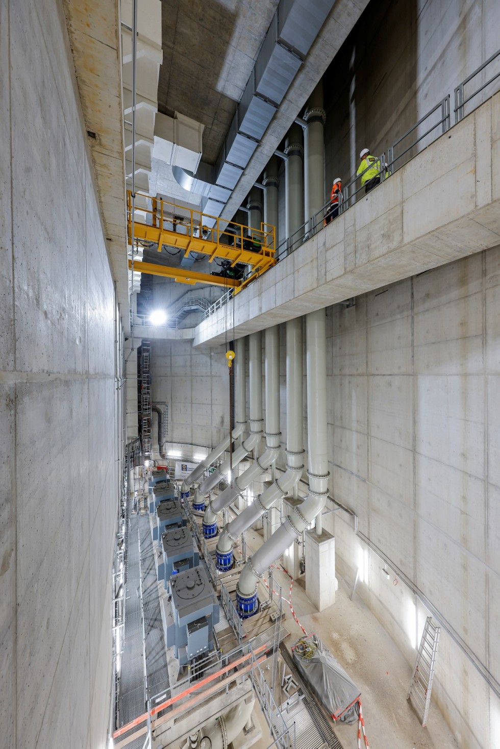 Stattdessen entschieden sich die Ingenieure für den Bau von drei riesigen Pumpwerken. Wie ein Aufzug befördern sie das Wasser aus bis zu 40 m Tiefe wieder nach oben, damit der nächste Kanalabschnitt wieder näher an der Oberfläche verlegt werden kann. Insgesamt sind es drei Pumpwerke: Die beiden in Gelsenkirchen und Bottrop gingen 2018 in Betrieb, das dritte und größte in Oberhausen wurde im August in Betrieb genommen.