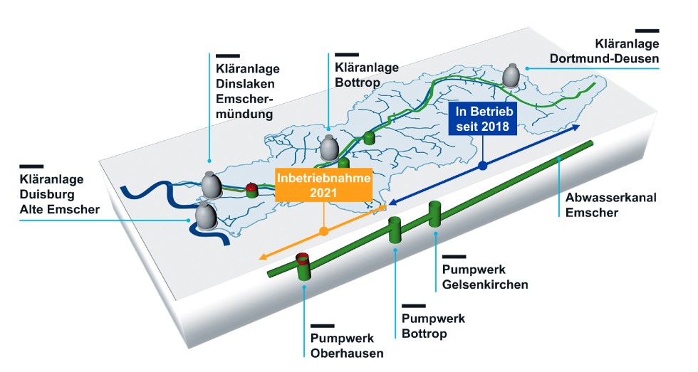 Möglich wird das durch ein riesiges Bauprojekt in der Wasserwirtschaft. Allein in den Hauptkanal wurden 1,2 Mrd. € investiert. Das gesamte Projekt hat annähernd 5 Mrd. € gekostet. Ziel ist, dass Abwässer, die vorher oberirdisch durch den Fluss transportiert wurden, nun getrennt in einem eigenen Kanalnetz verlaufen. Der Emscherkanal ist der sogenannte Hauptsammler, der Tiefpunkt also eines Abwassersystems, in dem die Brühe nun unterirdisch fließt. Bei einer Länge von 51 km und einem benötigten Gefälle von 1,5 Promille hatte die Emschergenossenschaft den Kanal in 80 m Tiefe verlegen müssen, wäre er in einem geraden Stück gebaut worden.