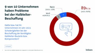 Und zwei Drittel (68 %) der befragten Unternehmen rechnen damit, dass die Lieferverzögerungen 2024 zunehmen werden, jedes fünfte (19 %) rechnet mit der Fortschreibung des Status quo. Für die meisten der befragten Firmen (83 %) sind Chips für das eigene Geschäft unverzichtbar.