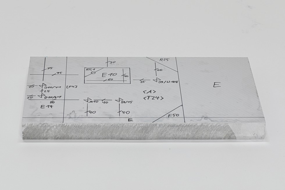 Tobias Herrmann von der Abteilung Leichtbautechnologien am Fraunhofer-Institut für Produktionstechnik und Automatisierung IPA hat nun einen Weg gefunden, wie in Konstruktion und Fertigung einige dieser vielen Prozessschritte eingespart werden können. CAD-Modell und technische Zeichnung werden dabei ersetzt durch eine Nomenklatur aus neun grundlegenden Zeichen, mit denen alles angegeben werden kann, was eine Fräsmaschine umsetzen soll. Diese Zeichen schreibt eine Werkerin oder ein Werker mit einem Stift direkt auf das Rohmaterial: R5 steht zum Beispiel für eine Rundung mit einem Radius von 5 mm, F20 für eine 20 mm breite Fase oder E10 für eine Ausfräsung von 10 mm, deren exakte Form und Abmessung anhand von Linien auf dem Rohmaterial vorgegeben sind.