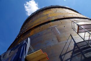 „Zeitplan übererfüllt!“ Beim Bau des 70 m hohen Wärmespeichers mit 26 m Durchmesser neben dem Heizkraftwerk (HKW) Nürnberg-Sand-