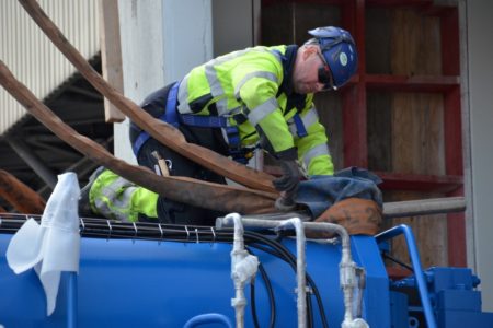 Der Zeitplan ist eng gestrickt seit dem Spatenstich im Juli 2013. Deshalb ist Gerhard Engelhard, der Stellvertretende Projektleiter, sichtlich froh über den vergangenen milden Winter. Denn vor allem der hatte es möglich gemacht, dass der aus Stahlteilen zusammengeschweißte, riesige Heißwasserbehälter bereits jetzt gut 40 m in die Höhe gewachsen ist.