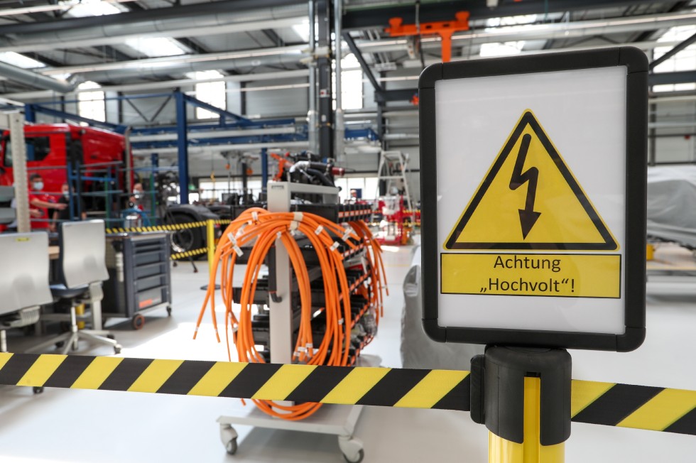 Doch gleich hinter dem Eingang wird schnell sichtbar: Hier wird eine Zeitenwende vorbereitet. Denn ein schwarz-gelb gestreiftes Absperrband und ein großes Schild – „Achtung! Hochvolt“ – stoppen den weiteren Weg in die fußballplatzgroße Halle. „Hier entsteht Tag für Tag ein Stück mehr unserer Fertigung von vollelektrischen Lkw“, sagt Holger von der Heide, Planungsleiter Produktion Truck bei MAN.