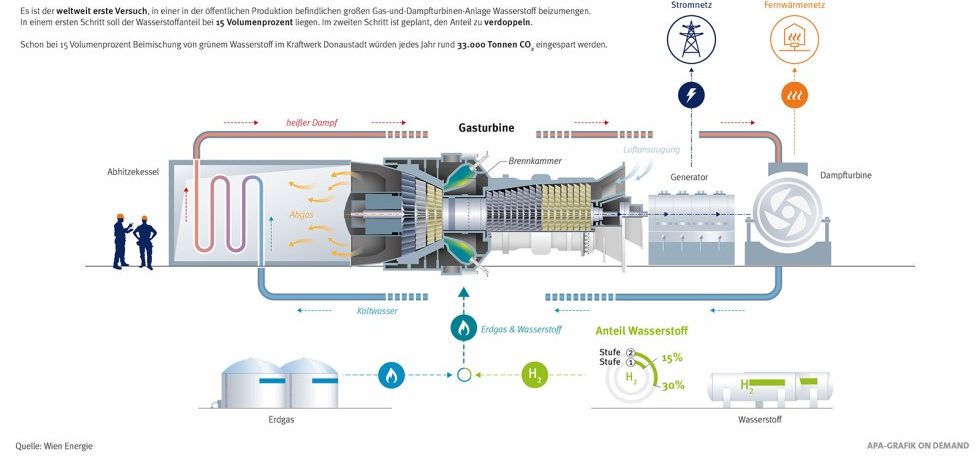 In einem gemeinsamen Betriebsversuch in einer Kraft-Wärme-Kopplungsanlage von Wien Energie soll Wasserstoff unter Realbedingungen zum Einsatz kommen, er soll dabei dem normalerweise eingesetzten Erdgas beigemischt werden. Dies sei der weltweit erste Versuch, in einer in öffentlicher Produktion befindlichen großen Gas-und-Dampfturbinen-Anlage Wasserstoff beizumengen, so das deutsch-österreichische Forschungskonsortium, dem auch das Kölner Stadtwerkeunternehmen Rheinenergie, der österreichische Energiekonzern Verbund und der Technologielieferant Siemens Energy angehören.