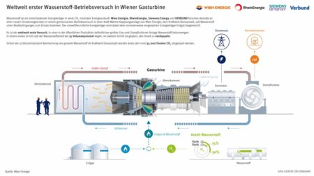 Am Kraftwerksstandort in Wien werde der erste Praxistest dieser Art an einer „heavy duty gas turbine“ vorgenommen, so eine Mitteilung der Rheinenergie. Ab dem Frühjahr will man mit den erforderlichen Umbaumaßnahmen an der Gasturbine beginnen, die Wasserstoffbeimischung könnte dann 2023 erfolgen. „Wir sind überzeugt, dass innovative Technologien und der Einsatz von Wasserstoff der wichtigste Schlüssel zur Bekämpfung des Klimawandels sind“, erklärt Aleš Prešern, Geschäftsführer von Siemens Energy Austria, den Ansatzpunkt des Turbinenherstellers. Die Erkenntnisse aus diesen Versuchen sollen auch in die Entwicklung der nächsten Generation von Gasturbinen einfließen.
