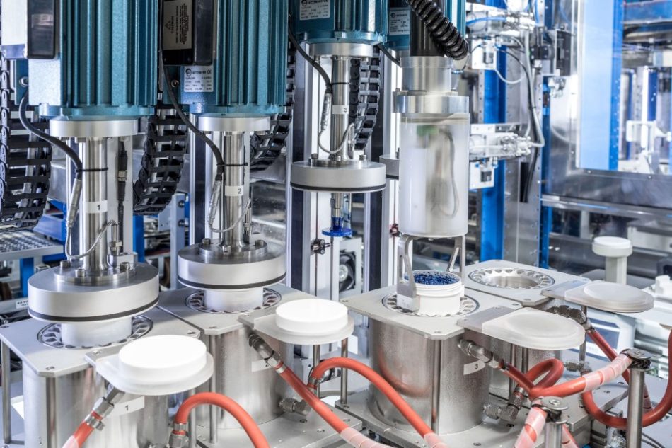 Behutsam schraubt der Roboterarm den Becher auf und stellt ihn mit dem Deckel zusammen aufs Shuttle. Gemeinsam gleiten die beiden auf einer Schiene zum ersten Modul, wo der nächste Roboterarm die Kartusche mit dem Bindemittel über den Becher hält. Mit deutlichem Klacken öffnet sich das Ventil, in einem kräftigen Strahl ergießt sich die Flüssigkeit in den Behälter. TokTokTok – so tröpfelt der letzte Rest nach, bis die gewünschte Menge exakt dosiert ist. Hinüber geht es zur nächsten Station, wo Pulver in den Behälter rieselt.