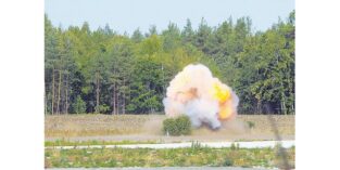 So gerüstet, geht es im Autokonvoi durch den Kiefernwald. An einer Stelle neben der asphaltierten Straße sind noch die Betonschwellen aufeinandergestapelt, aus denen zu DDR-Zeiten die Piste bestand. Ist hier auf dem abgesperrten Gelände also vieles geschichtsträchtig, vor allem die noch immer im Boden liegende Munition, so ist der „Sprengplatz 2“ neu.
