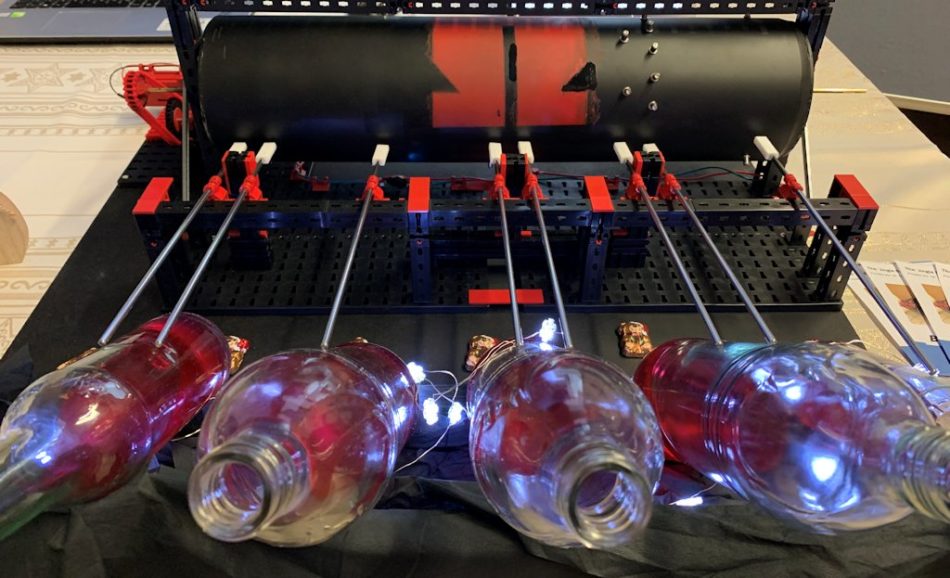 Die Studierenden der Fakultät Maschinenbau und Versorgungstechnik der TH Nürnberg heben dieses physikalische Phänomen der Flaschenmusik auf das nächste Level. In ihrer Projektwoche entwickeln sie in Gruppen verschiedene Flaschenmusikmaschinen, die selbstständig eine vorgegebene Melodie auf Flaschen spielen können, und kreierten so die Flaschenmusik 4.0.