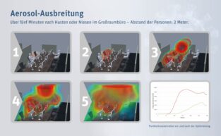 Aktuelle Untersuchungen deuten auf die hohe Gefahr der Übertragung des neuartigen Coronavirus Sars-CoV-2 durch Aerosole hin. Ein Simulationsspezialist hat die potenzielle Verbreitung für sein eigenes Großraumbüro durchgerechnet und daraus Maßnahmen abgeleitet.